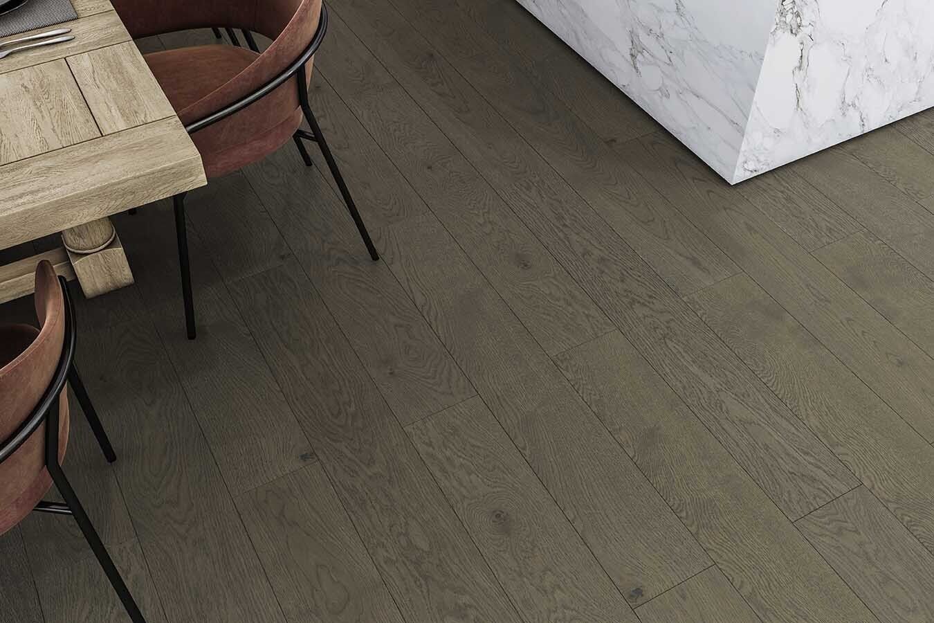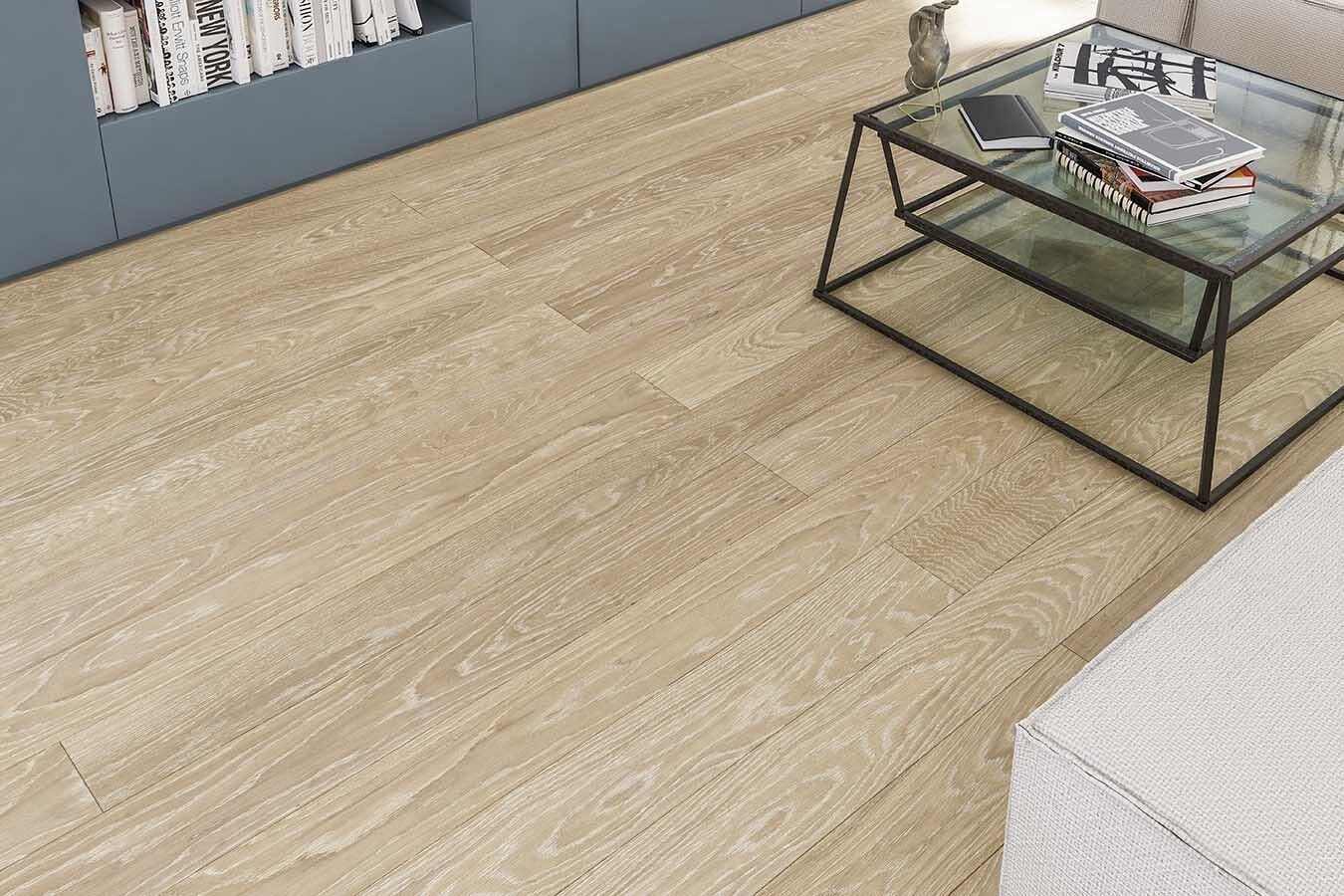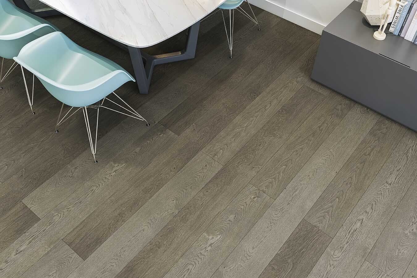 Suelo de 10 y 13 mm de espesor de 1 lama, capa intermedia de HDF, con capa noble de 2 mm en calidades de madera Premium y Elegance.
